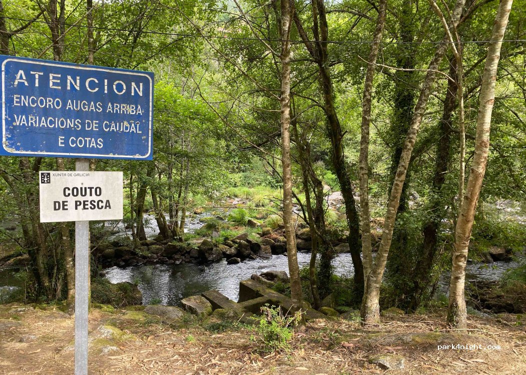 Mooie plek aan stromend water. Wel wat geluid van het Hidroeléctrica gebouw. De weg is wel steil naar boven en beneden, maar goed te doen voor ons (Sprinter L3H2). (Vanaf de PO-221 weg! De makkelijkste weg). Mooie wandelroute richting het plaatsje Caldas de Reis.