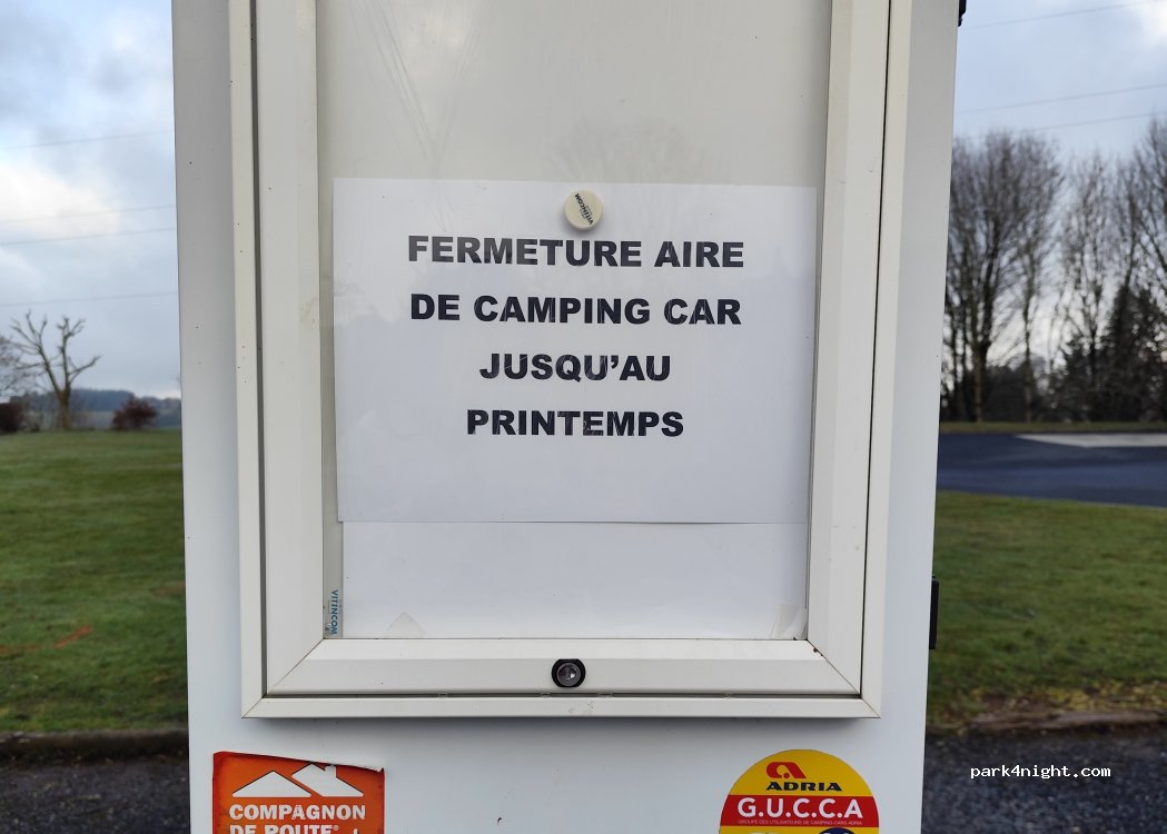 nous nous sommes arrêté faire le plein d eau 2eu la borne fonctionne très bien aire superbe une grande douche un grand WC tout très propre emplacements bien délimités par des haies gratuit merci la mairie
