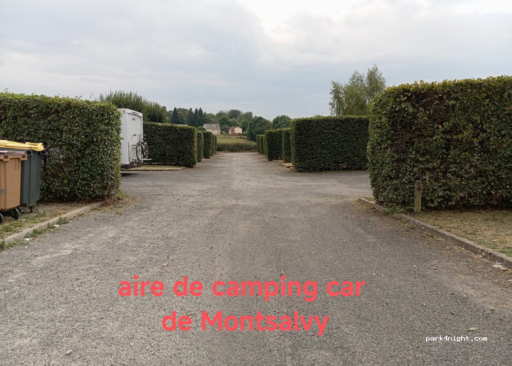 super aire de repos au calme, emplacement délimité par de belles haies, toilettes PMR, douche à 1€ qui dure un bon moment, vidange, 100l d'eau à 2€, pas d'électricité,commerces à 700m, espace pour les chiens...merci à la commune de Montsalvy (cantal) pour ses prestations.