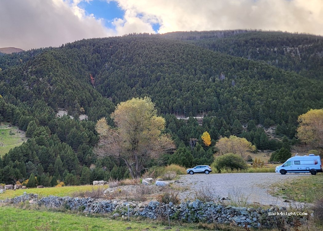 Parking muy tranquilo y con muchas rutas de senderismo o coger setas en época. Los únicos coches que pasan son los que se dirigen al refugio. Mucho hueco tanto para furgonetas de todo tipo como para AC.