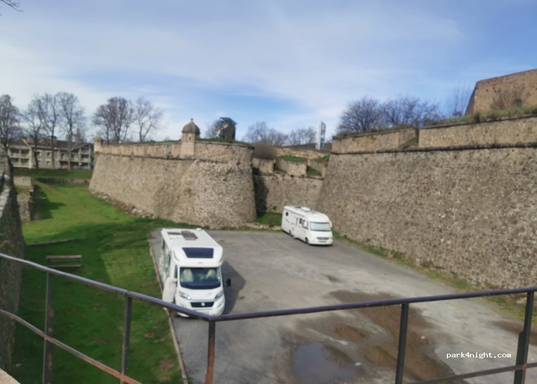 Possibilité de vidanger eaux grises et eaux noires (petite plaque d'égout à côté des eaux grises, au pied de l'arche) gratuitement et d'y stationner pour visiter la citadelle. Par contre il n'y a pas d'eau et le parking étant complètement ouvert, des voitures viennent aussi se garer dans cette partie ce qui peut rendre difficile, voire impossible, la manœuvre pour accéder aux eaux grises.