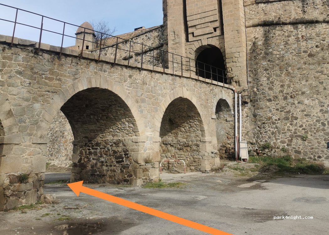 Passer sous les arches pour accéder à l'aire, la vidange et le remplissage se font sous l'arche de droite en arrivant. Super emplacement pour visiter le village situé dans le fort.