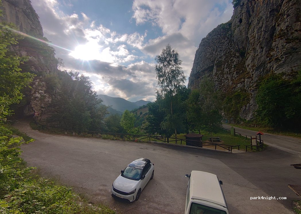 Entrada a Cueva Huerta. Aparcamiento en cuesta para10 vehículos, de donde parte un sendero que conecta con el parque de l prehistoria y la senda del oso. Hay 5 mesas de picnic y hermosas vistas. Muy cerca están las pinturas ruprestres de Fresnedo, en otra zona de picnic.