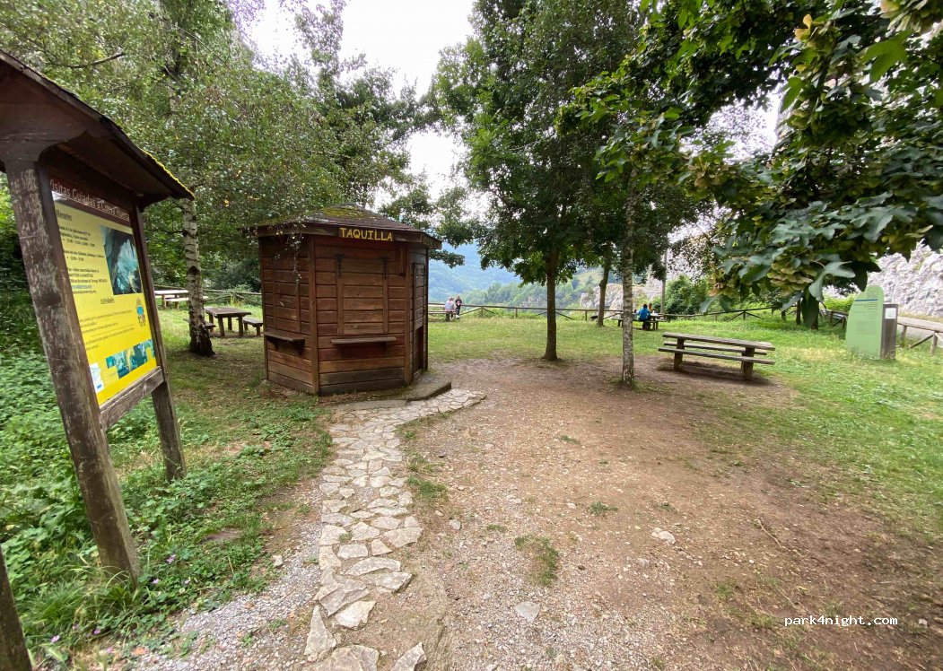 Entrance to Cueva Huerta. Sloped parking for 10 vehicles, from where a path that connects with the prehistory park and the bear path starts. There are 5 picnic tables and beautiful views. Nearby are the Fresnedo rock paintings, in another picnic area.