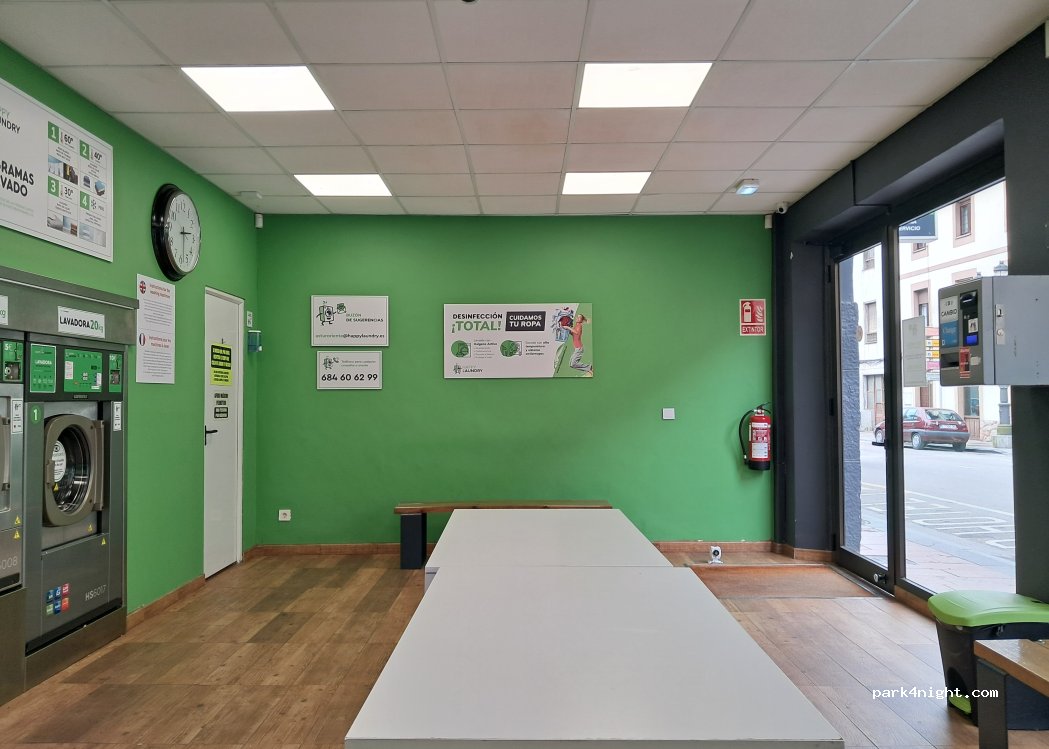 5 mins from motorhome car park. Good wifi. Great machines and cafes nearby. Open 8am to 10pm. Dryers; 3€ for 12 mins of 20kg machine