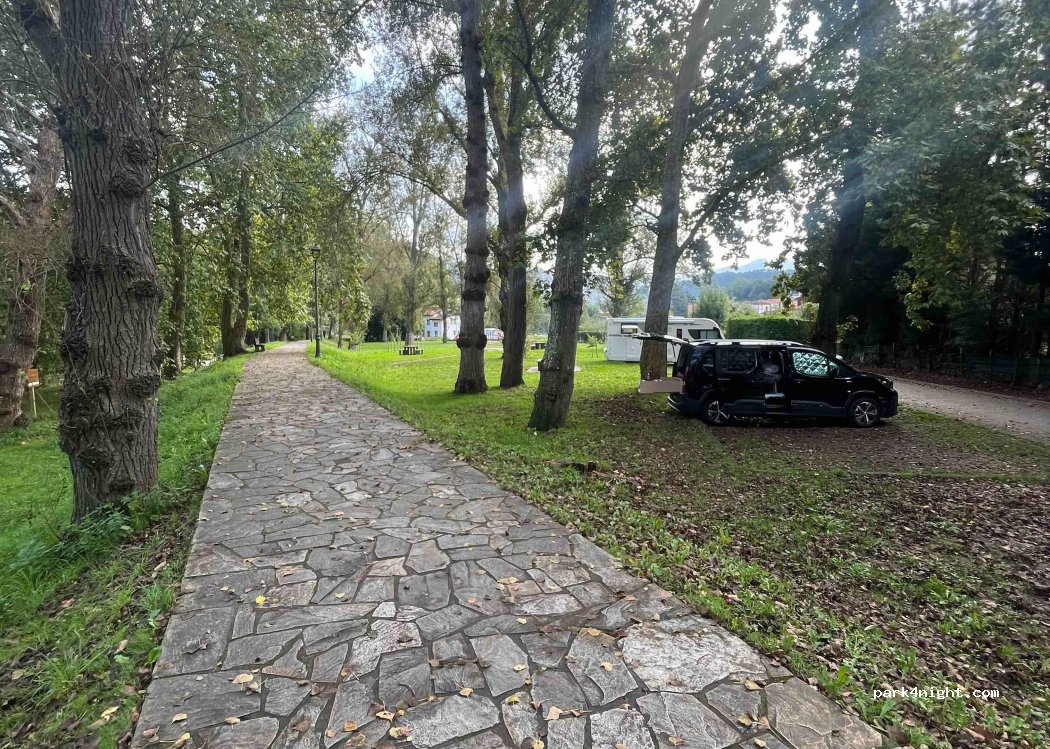 Un parque bastante agradable al lado del río con sus mesas de piknik, un chiringuito al lado y cerquita del pueblo. es bastante movimentado hasta las 22h, después un silencio agradable. esta noche estuvimos dos autos y una furgo.