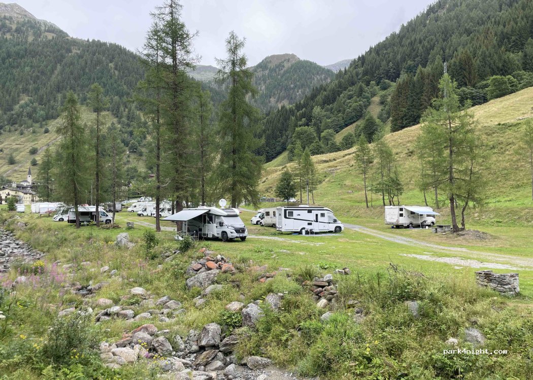 area sosta su erba. molto ampia non c'è necessità di prenotare. abbiamo pagato 11€ senza corrente (disponibile ma non per tutti,al costo di 2€)presenti tavoli e barbecue. laterale scorre il torrente,molto rilassante. il cellulare non prende, la wifi dell'area sosta va e viene. partono diversi sentieri un po' difficili.a 5minuti a piedi un bar per le brioches. abbiamo apprezzato il bel fresco ad agosto
