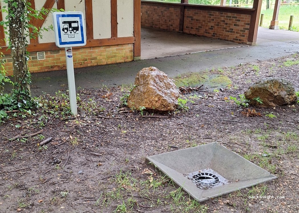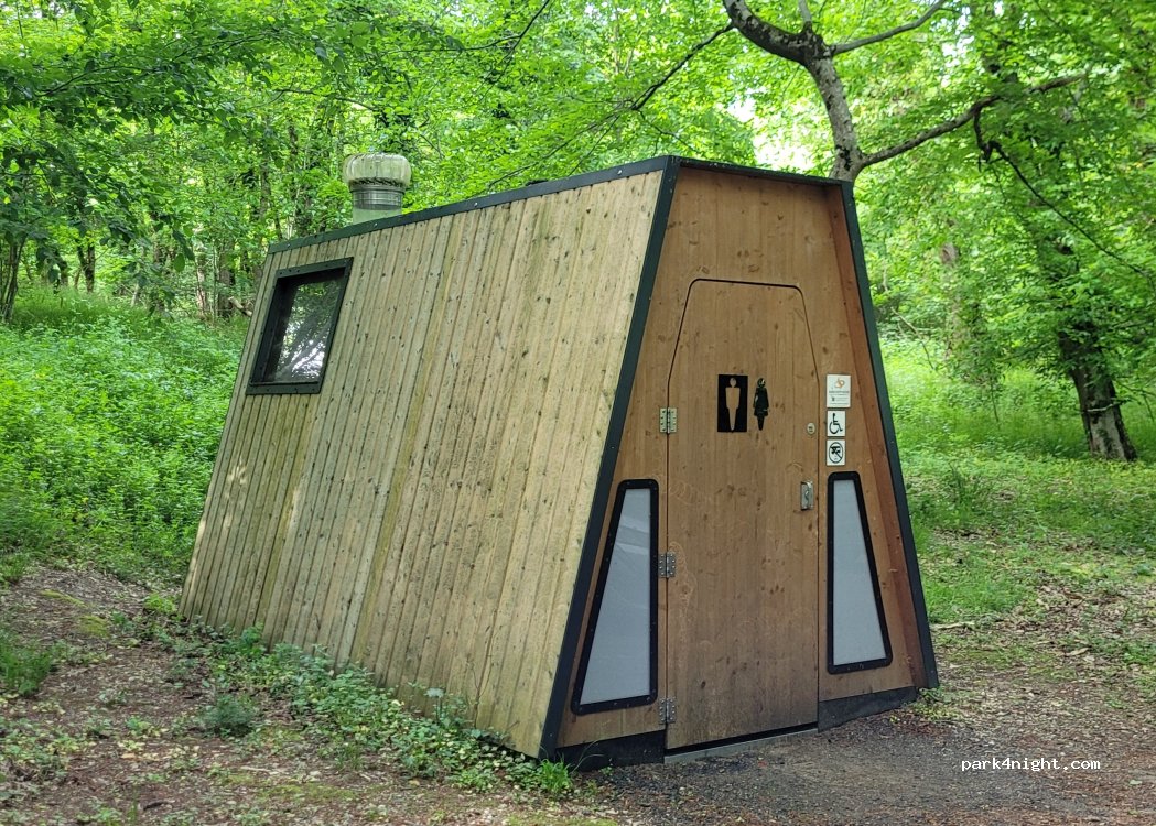 Grand parking semi ombragé au bord de l'étang, jeux pour enfants dans la forêt. Tables de pique-nique sous les arbres. Toilettes publiques. Vidange des eaux usées.