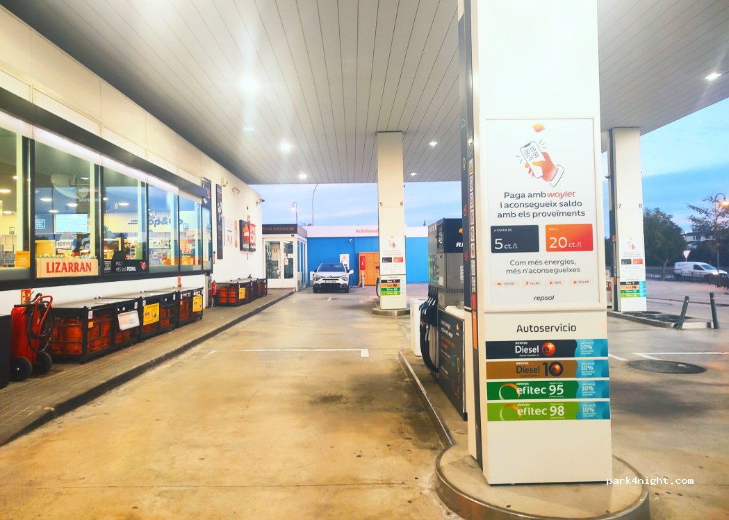 Station-service Repsol avec laveuse et sécheuse en libre-service. Eau et air gratuits.