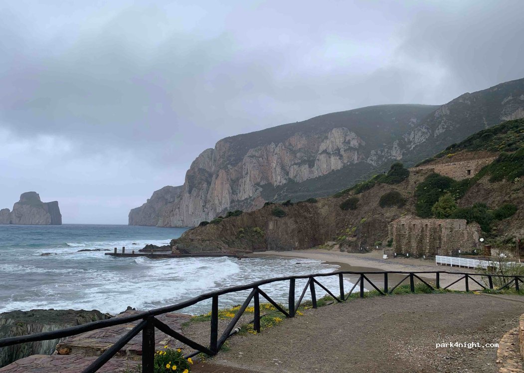 Ein schöner Ort zum Parken und Übernachten! Am Tage viele PKW‘s aber nachts absolut ruhig! Hier gibt’s zwei Strände mit kristall klarem Wasser und auch die Museums -Erz - Verladestation „Porto Flavia“ ist fussläufig zu erreichen und sehr lohnenswert! Mülltonnen vorhanden sonst kein Service!!
