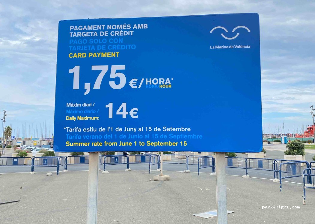 Estive aqui em 8/9/22, lugar genial, piso de cimento, relativamente plano e perto da praia . Um pouco longe do centro de valência, mas vale. 5 euros máximo por 24 Hs . Noite tranquila sem problemas.