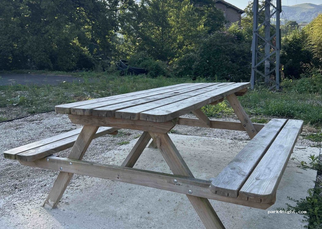 Area con 11 aparcamientos ubicada en un poligono. Un poco desnivelada pero nosotras pasamos la noche sin calzas y ni lo notamos. Riachuelo al lado y un par de mesas de picknik. Tiene servicio de contenedores y vaciado/llenado de aguas. Amanecimos un lunes aqui y no escuchamos el ruido de los camiones hasta las 10:30.