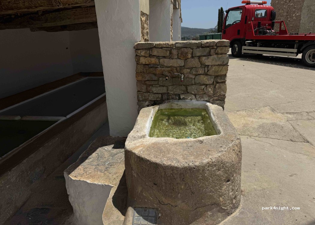 Place de la ville de Corcolilla, village d'Alpuente. La nuit, vous pouvez passer la nuit, c'est très calme et bien nivelé. C'est à côté d'un bar, le matin il y a plus de mouvement. Fontaine et conteneurs sur la même place. Four mauresque à côté de la place bien qu'ils ouvrent tard.