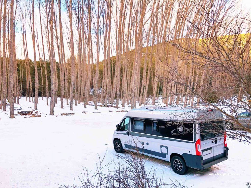Parking que da acceso directo a la ruta del nacimiento, pasamos una noche en la tranquilidad más absoluta, la carreterra está a 150 metros pero ni apenas pasan coches y ni se escuchan.