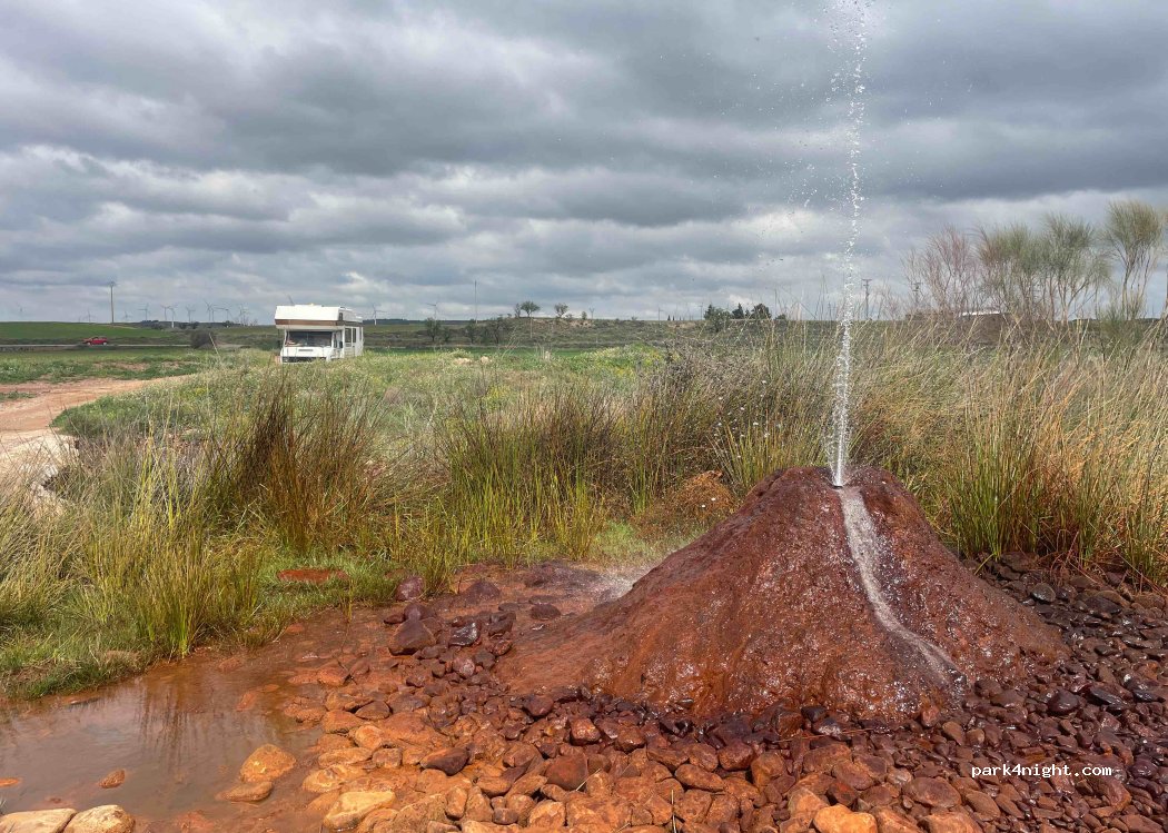 Un lugar curioso con un géiser de agua. Hay una mesita con bancos donde parar a comer.