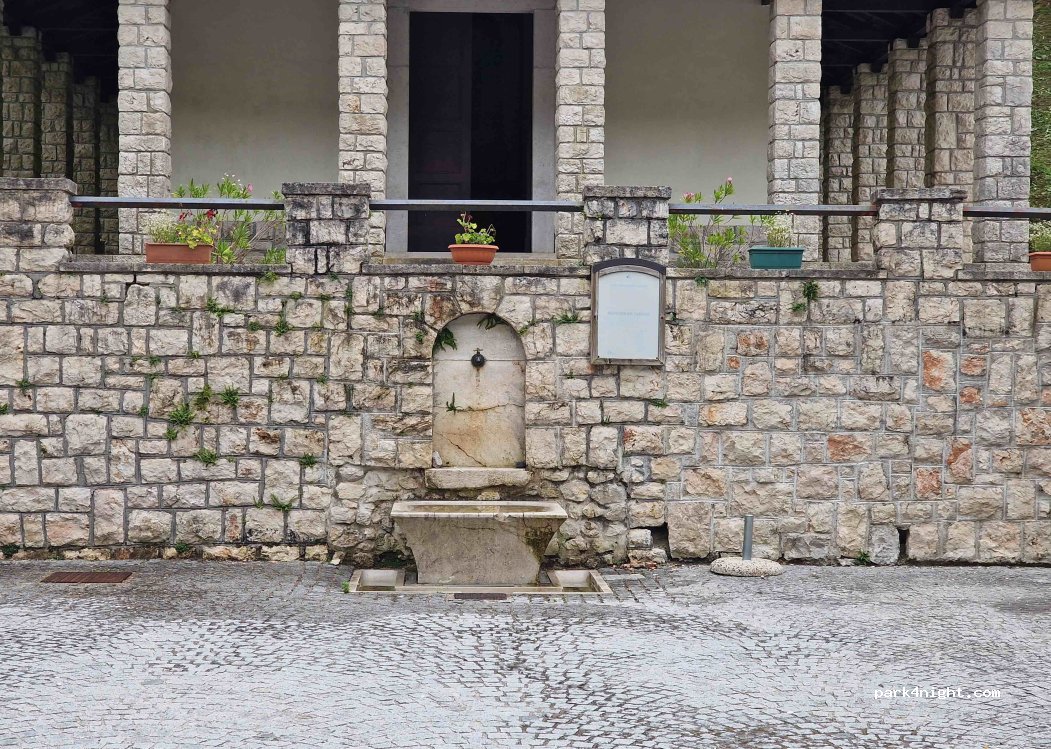 Parcheggio sul lago balneabile, Strada tranquilla e silenziosa la notte. Pizzeria/bar e fontana di acqua potabile nella piazzetta