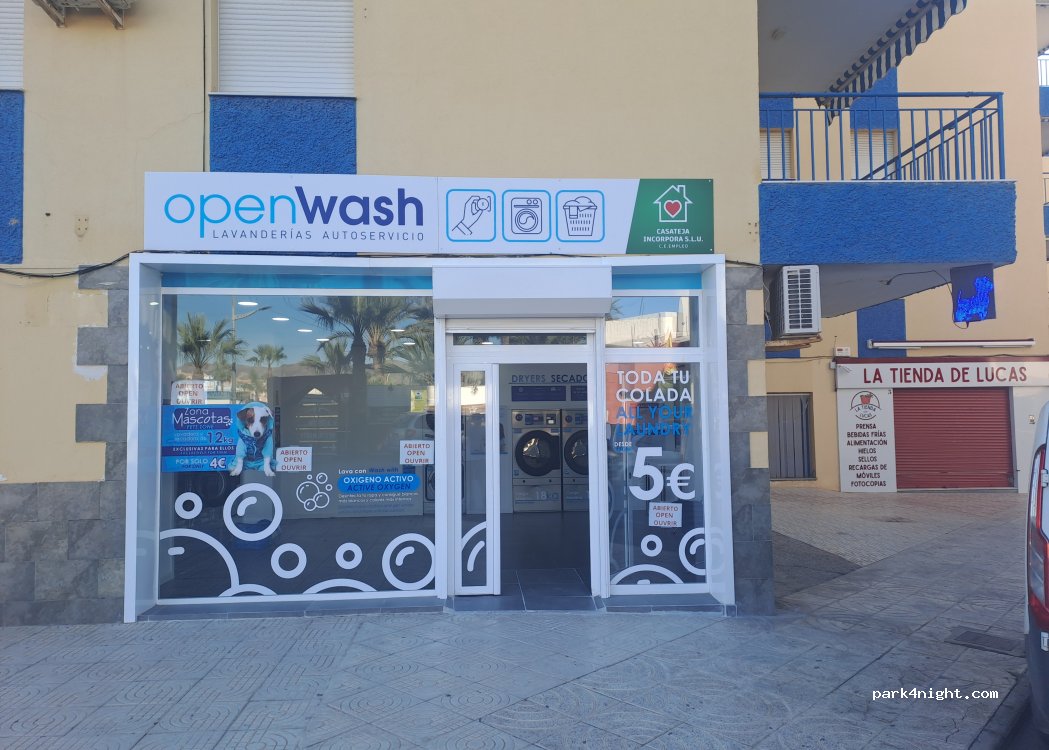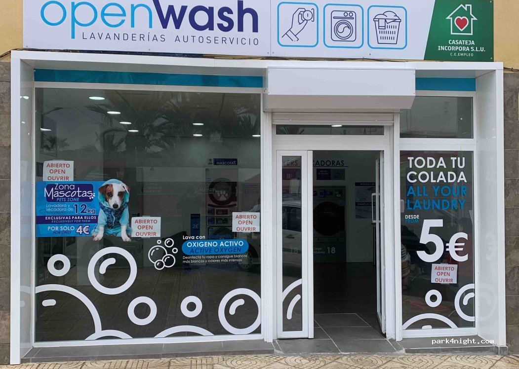 Lavado Abierto bidones de 12 y 16 kilos. Secar en secadora 18 kilos hasta 80 grados. Lavadora independiente para mantas de perros. Estacionamiento frente a la puerta posible, para estacionamiento móvil grande a 100 metros calle abajo.