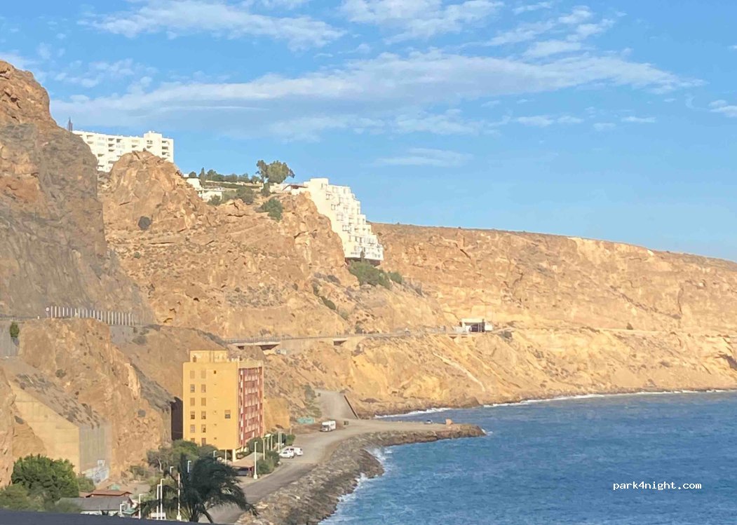 Direkt am Meer, an der Ecke unterhalb der Straße, kann man direkt neben einem großen Hotel parken. Es ist ruhig, obwohl es eine Diskothek gibt, die am Wochenende bis spät geöffnet hat. Der Platz bietet Platz für viele Wohnmobile, und die Polizei ist schon mehrmals ohne Vorwarnung vorbeigefahren. Dies ist ein ausgezeichnetes Gebiet zum Schwimmen und Schnorcheln, voller Kraken, Seesterne und Tausende von Fischen.