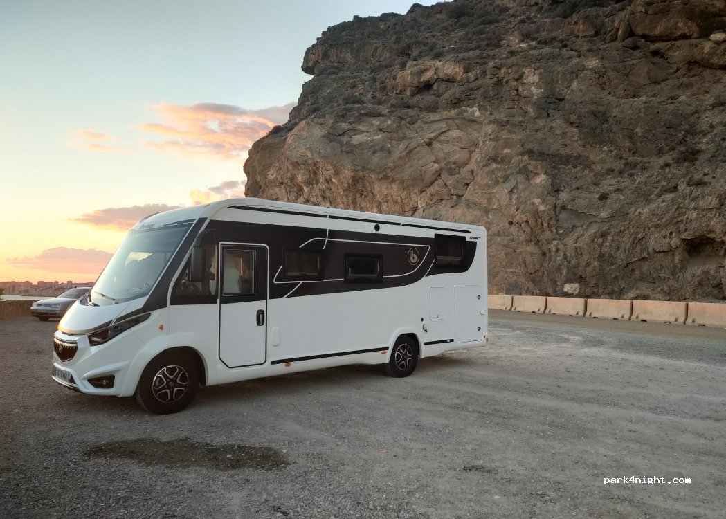 It's not just a mirador but a road leading up the hills so there was a lot more movement than we expected but the night was quiet. A few cars came for the sunset but then we were alone for the night and no one bothered us. Flat, gravel parking behind huge rock so no noise from the main road. Nothing special but beautiful sea views and away from the plastic so good enough