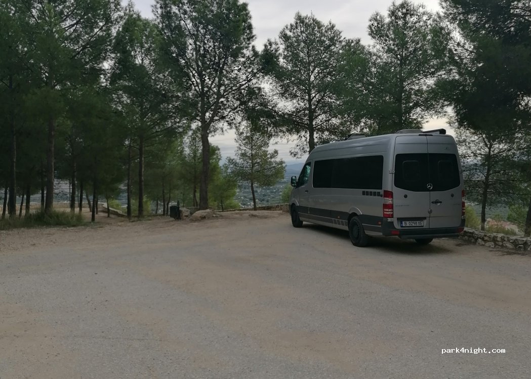 Beautiful viewpoint at the end of a cut and sloping road, on a hill, in the middle of a pine forest. The road ends in a wide and flat space to park well, and from there starts a small walkway to the viewpoint, with good views of Moratalla and the castle. Super quiet and very beautiful place, with wastebasket, containers and no passage of people. Be careful, although it is tempting and could be accessed by vehicle, you can NOT park at the viewpoint itself. The cleaners came to tell me to park in the driveway.