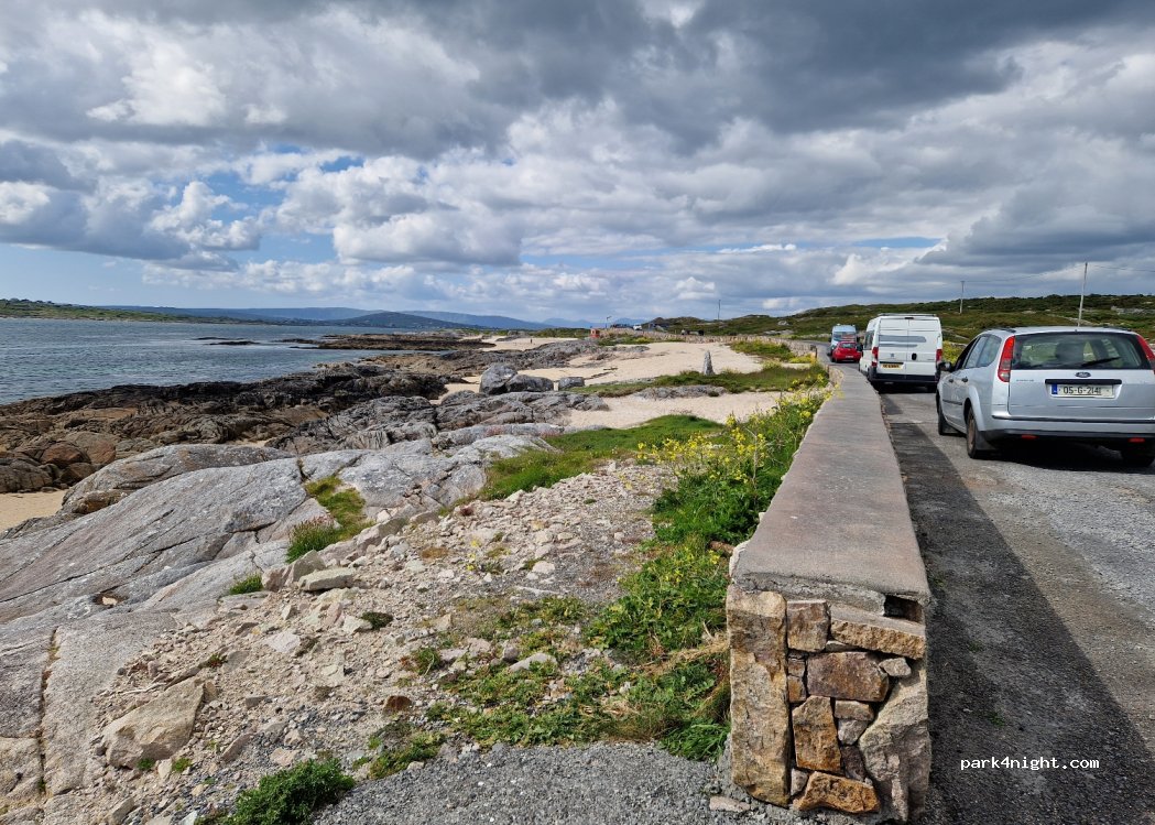 Beautiful. Lovely for swimming. Best stop during our three-week tour of Ireland (helped by lovely sun) and stayed for a couple of nights. Toilets closed at night. No sign of a shower anywhere. Great views. Crystal-clear waters. Good Eurospar grocery shop two miles up the road. Narrow-ish access and area, so best for smaller vans.