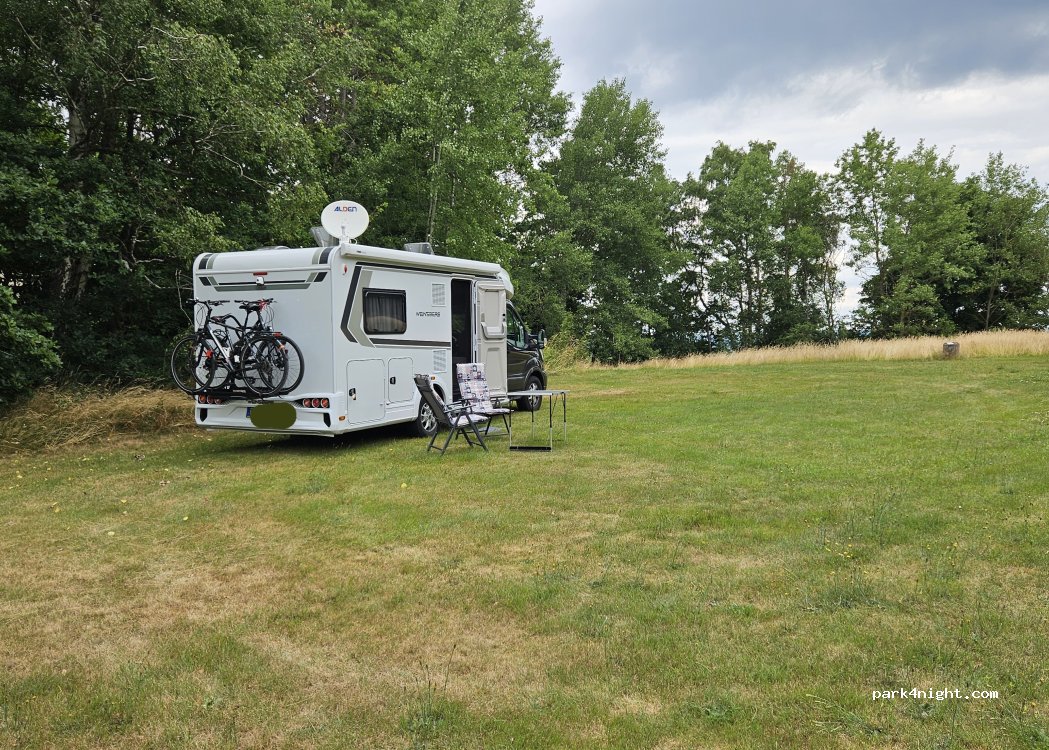 Sur une colline dans un pré derrière l'hôtel derrière une forêt. l'électricité et l'eau, la douche (dans l'espace bien-être = payant) et les toilettes peuvent être utilisées lorsque l'hôtel/restaurant est ouvert ! Avant tél. demandez la disponibilité! Le restaurant a très souvent des événements fermés! Itinéraire : à l'église jusqu'au sommet de la montagne ! Prendre la dernière courbe avec un peu de courage dans les longs véhicules