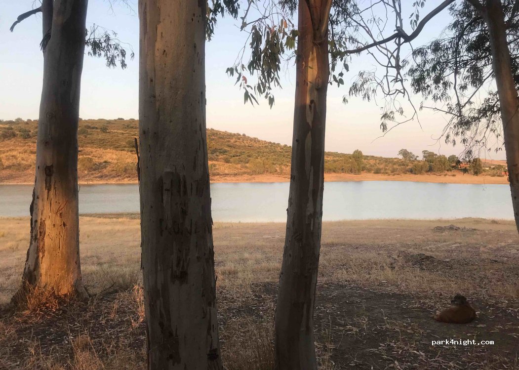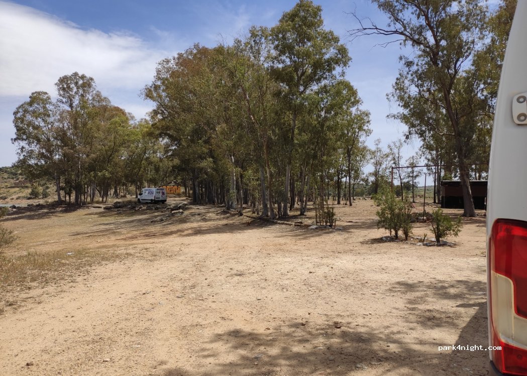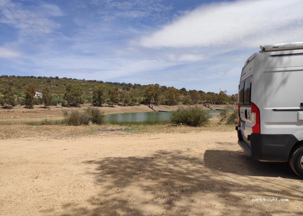 Petit réservoir, café (pas ouvert aujourd'hui) parking de niveau mais pas d'ombre ni de parc sous les arbres inégal. Beaucoup d'endroits pour se garer. Pies et eucalyptus. Peu de pêcheurs. Signes d'adolescents s'amusant, probablement le week-end. Calme et plus frais que partout où nous pouvions trouver.