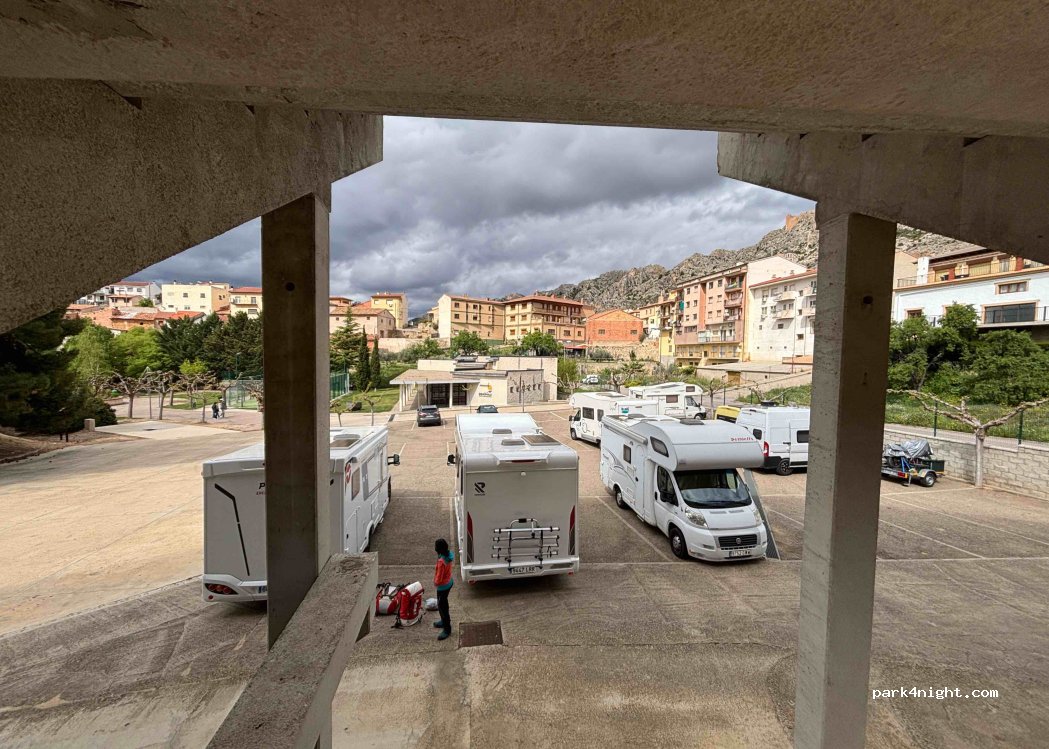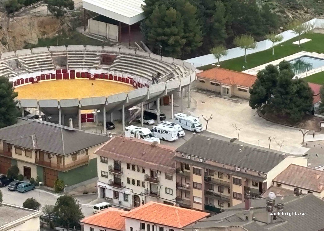 Aparcamiento de la plaza de toros y del bosque pétreo de Dinópolis. Las plazas, algunas bastante desniveladas, están marcadas para turismos pero hay zona de descarga para grises y en la entrada tienen el símbolo de caravanas. No he encontrado para vaciar negras y en la zona de descarga hay una arqueta con el símbolo del agua pero esta cerrada. Bajo las gradas de la plaza de toros hay sombra y bastante nivelado.