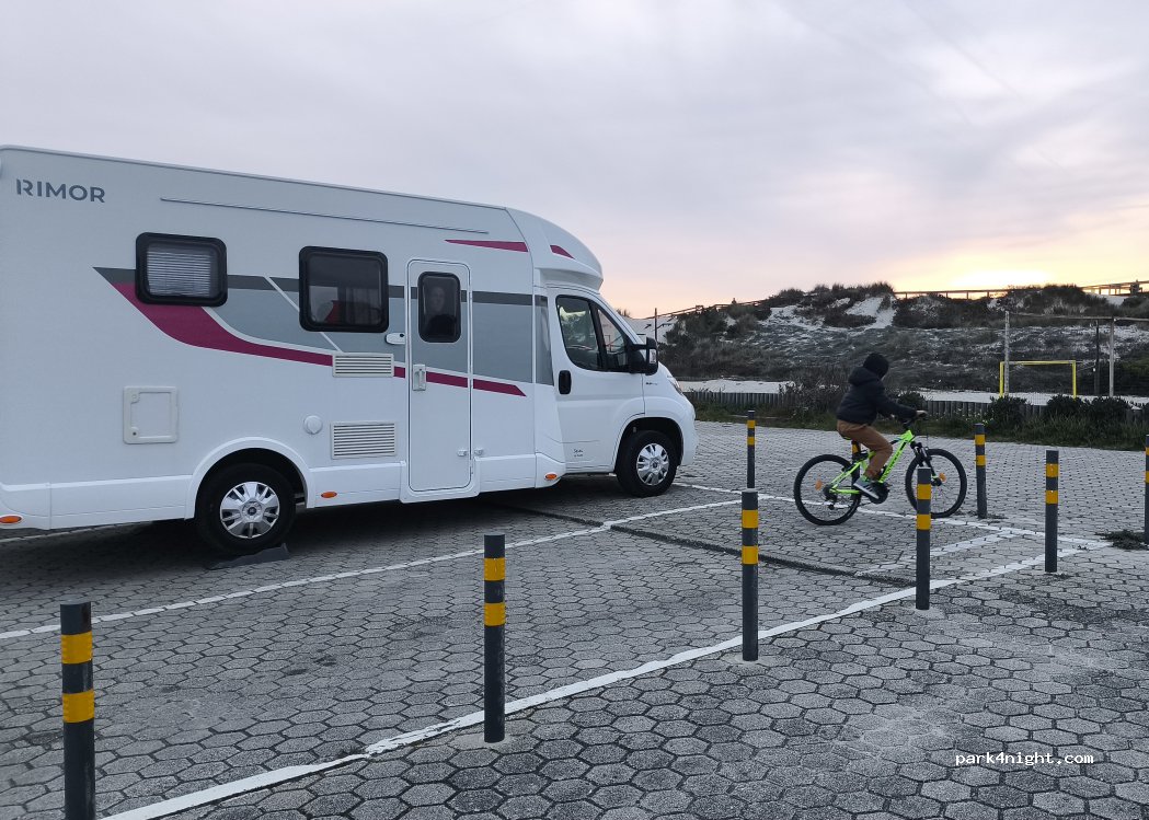 Flat area next to sea dunes, without shadows. Fresh, gray and black water service. Without electrical connection. In 2023-April, BY PRESSING THE GREEN BUTTON on the left just after the door, it OPENS and access is FREE (also always an information panel with a notice when you were paying). The surroundings can be noisy in summer and at night