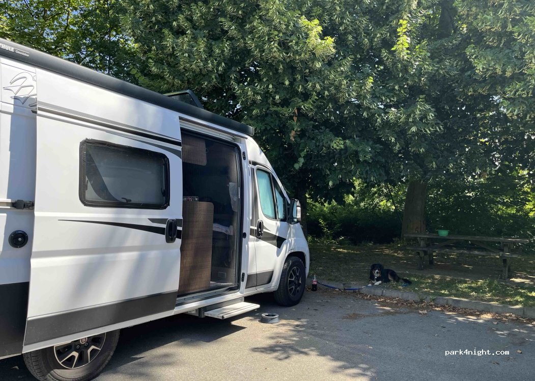 Está bien, muy llano para aparcar. Tiene una zona con mesas para comer. Como única pega, aparcan muchos coches pese a estar marcado como aparcamiento para caravanas. Para echar agua o conectar a electricidad, es necesario comprar una ficha (jeton), por ejemplo en la pizzería, restaurante o en la farmacia que hay al lado (2€ por 100 litros o 1 hora de electricidad)