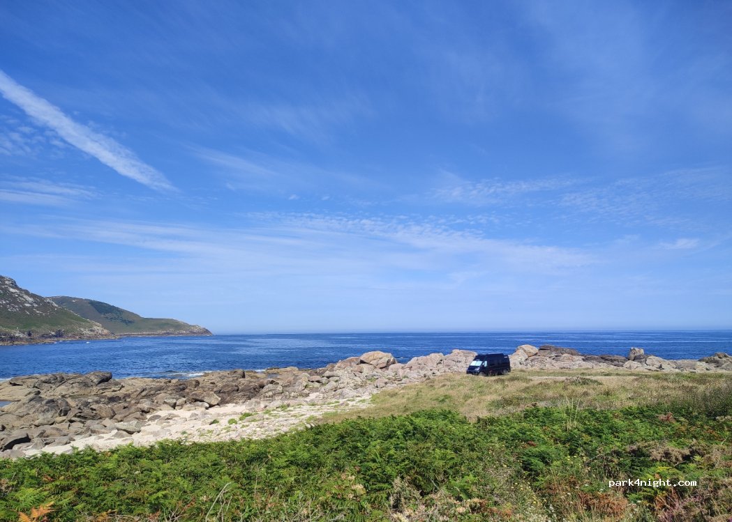 Estupendo espacio para 3/4 Vehiculos. Pasamos día y noche aquí. No había viento así que genial . Pequeña cala a unos pasos y pueblo de Muxia a 15 min andando .