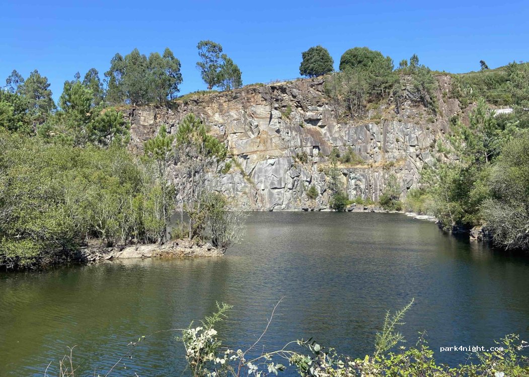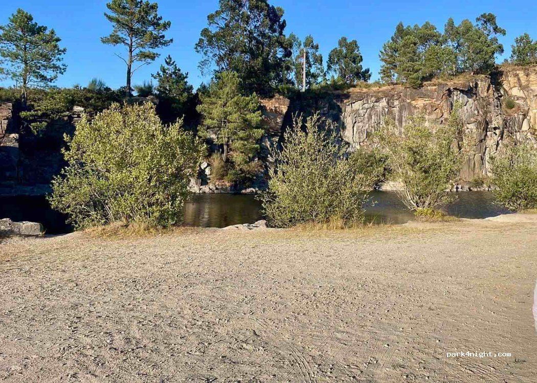 Next to a disused quarry that is now a beautiful lake for swimming and for the animals to enjoy. There are two accesses to the place, the first one that you find is bad for going up with the AC and the second a little further on with which you get to the site well. quiet area with the possibility of bathing and walks. our motorhome is 7m and it arrived without problem. !!!!!!!There are two paths through which you can climb. one steep and full of potholes and another that is feasible to go with a large motorhome, see well on Google Maps or go down and look for the road before taking the first one you see !!!!!!