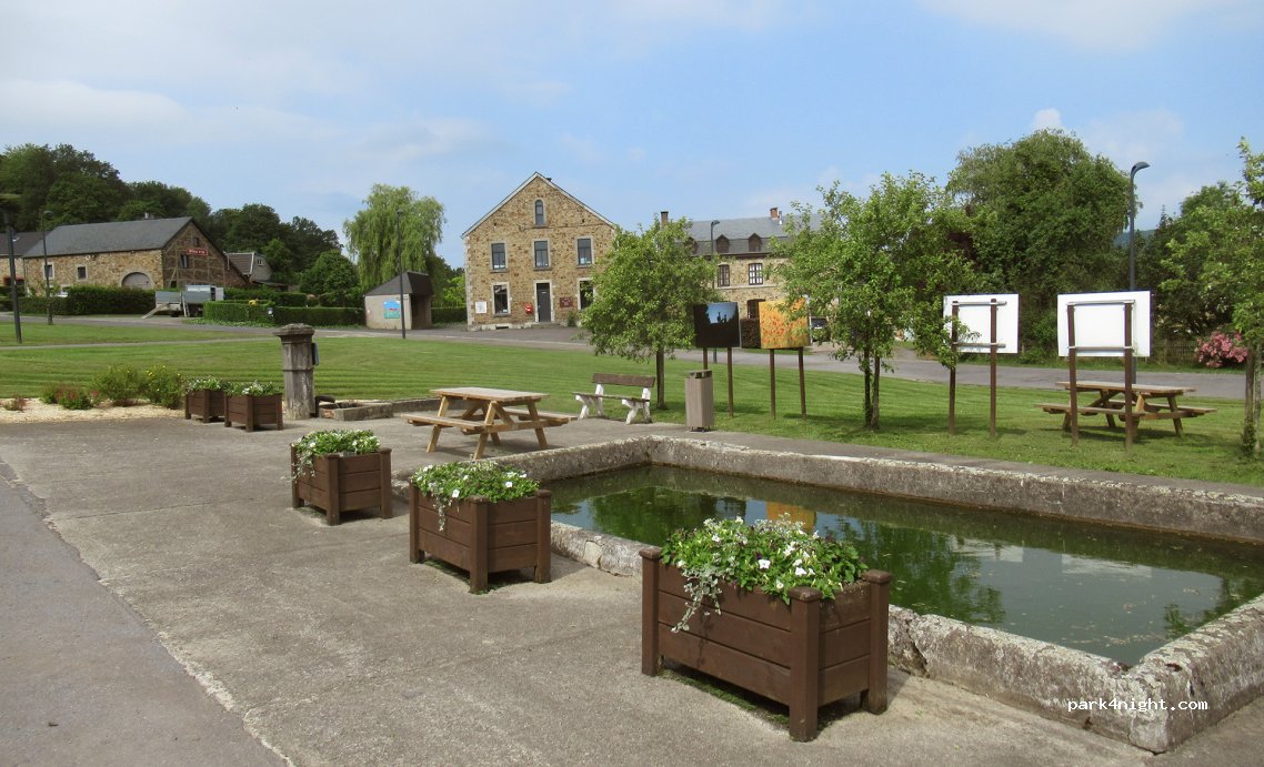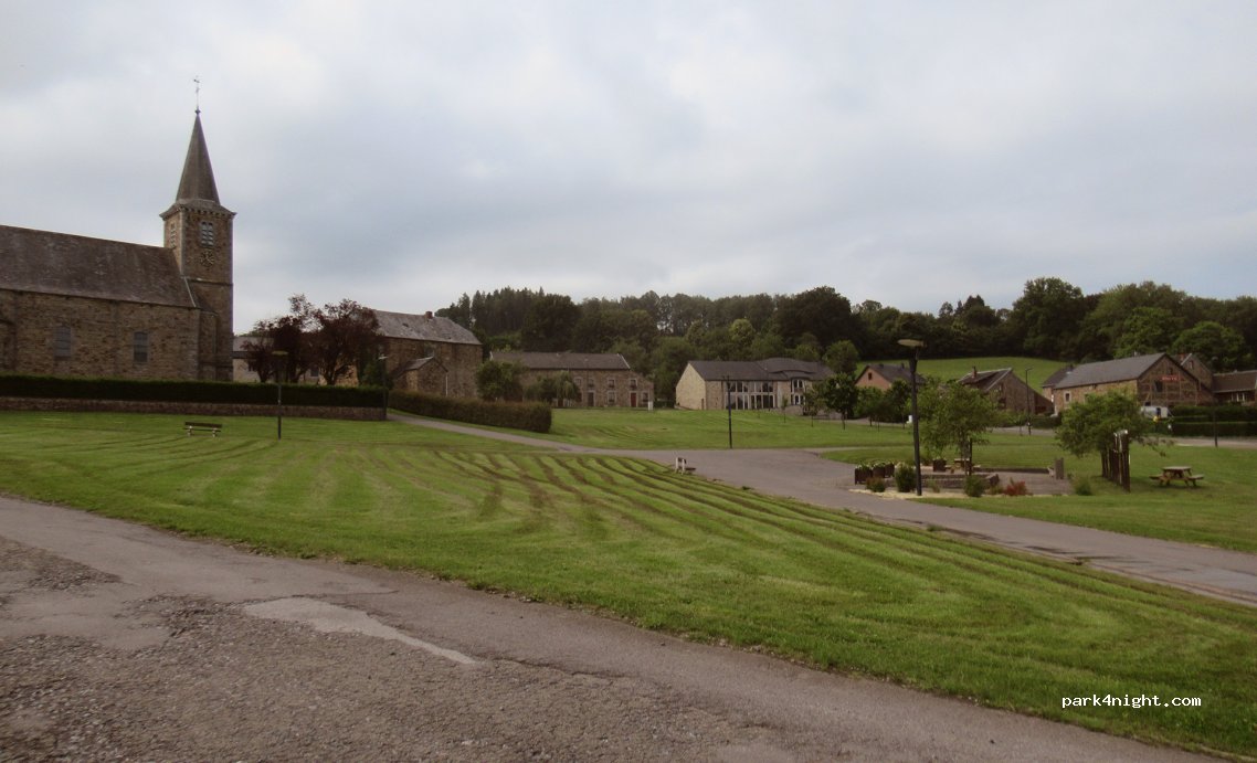 Belle place croisée en pelouse, les maisons sont en moellons jaunes, c'est très uniforme.Il y a poubelle et tables de pique-nique et pas beaucoup de passage.Peut-être possible d'y dormir. Pour 2 camping-cars, voir plus.