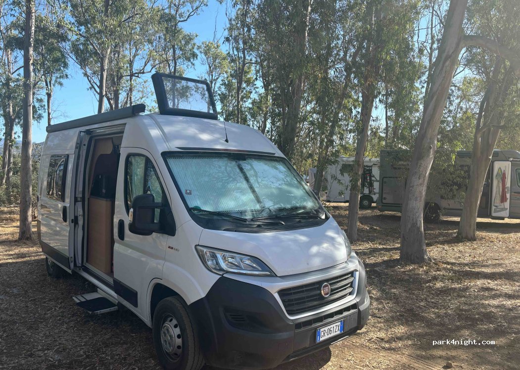 Ottimo posteggio per andare alla spiaggia di porto giunco.7,50 al giorno la notte si sta molto bene! unica pecca non si può mettere sedie all'esterno perché i vigili non vogliono. per il resto tutto ok ciclabile fino al paese che dista 10 minuti