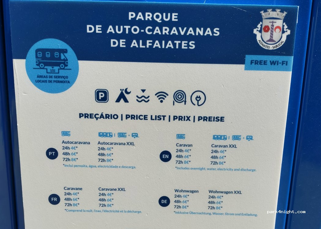 4€ 24h electricidade incluída. Sitio muito agradável mas falta fiscalização, estava cheio de jovens a acampar dentro, cerca de 8 tendas com as suas viaturas. Não ficámos pois a noite iria ser animada. Pode ser um sítio encantador fora do verão.
