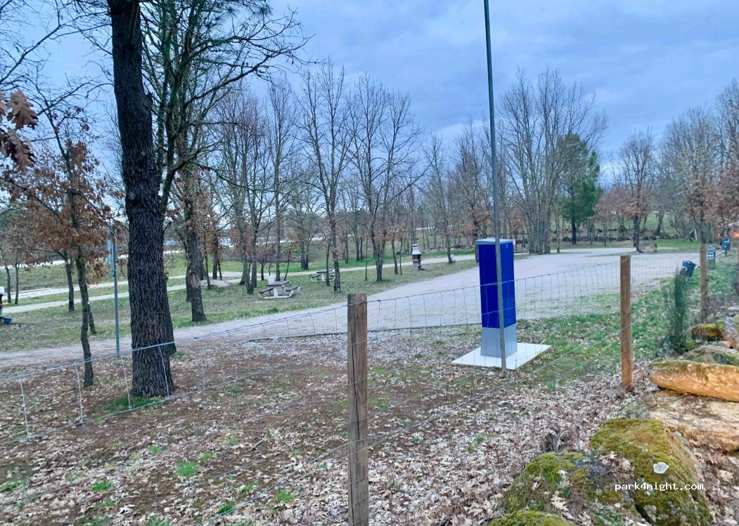 Sitio precioso, muy tranquilo. El GPS nos jugó mala pasada... sigue la carretera adoquinada hasta la entrada. La noche del 30-6 las barreras estaban levantadas y no funcionaba la terminal de pagos, no pudimos pagar la luz aunque si funcionó. Buena potencia incluso para un microondas. El bar estaba cerrado cuando llegamos y cuando nos fuimos. Vaciado y llenado perfecto. Mesas barbacoas, sombra...