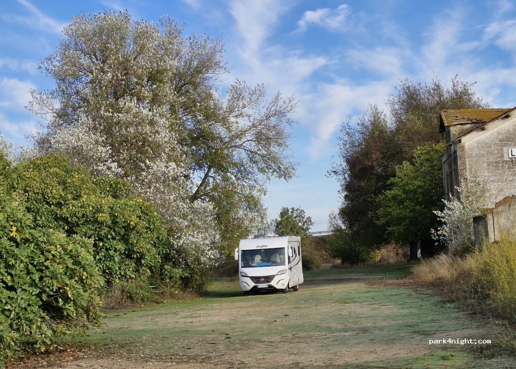 Vecchia stazione ferroviaria. Parcheggio in piano con molta ombra per 5 ac. Posto tranquillo dove passare la notte