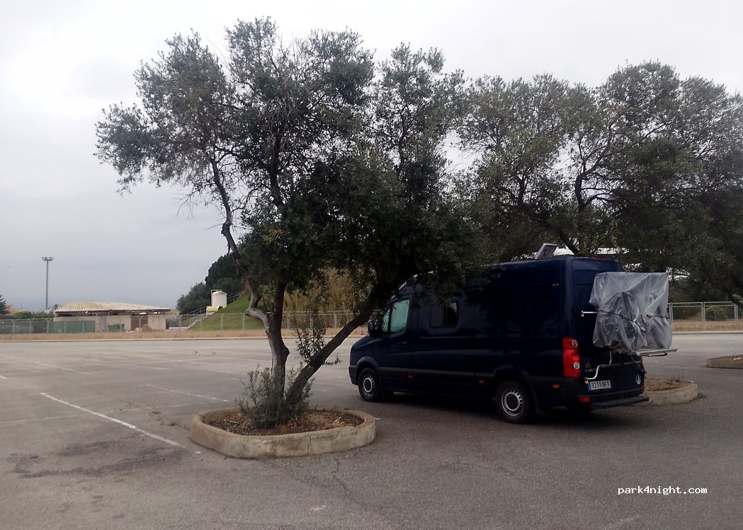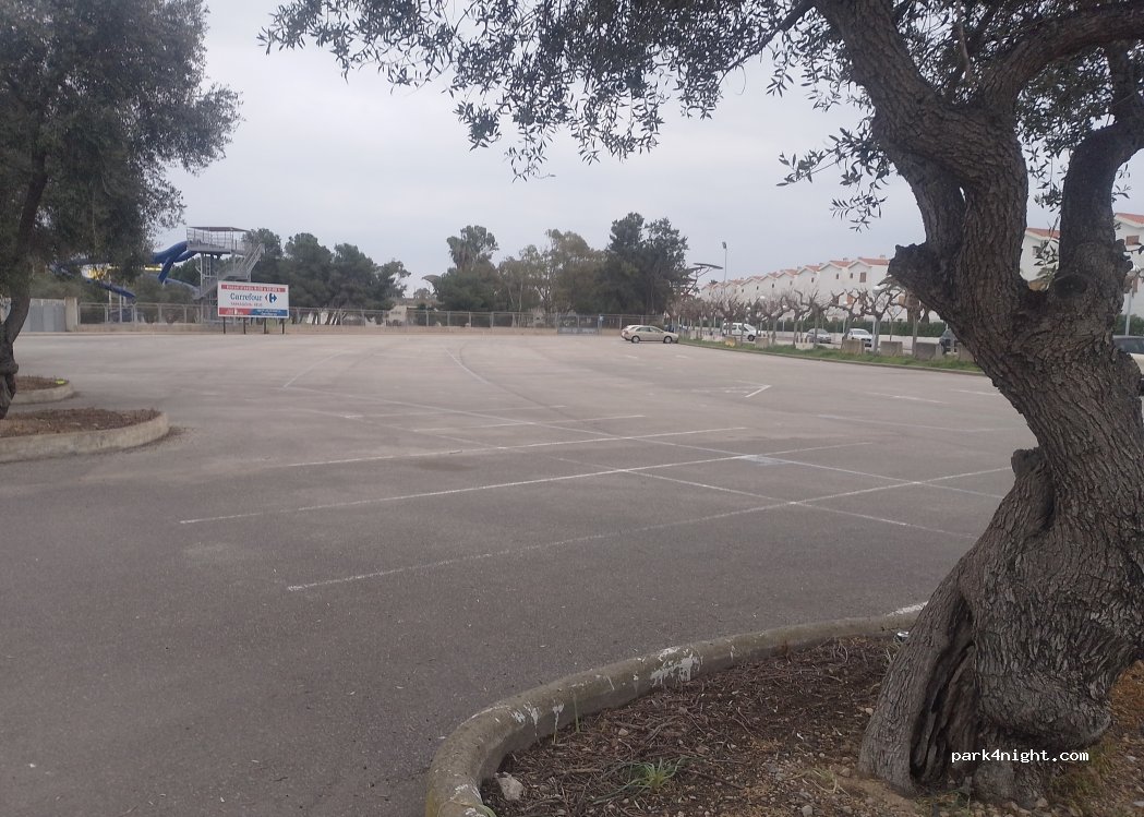 es el parking que se habilita para ir a Aquópolis. es de pago. desconozco si se puede pernoctar, lo que es seguro que también es el parking de la discoteca Pacha.