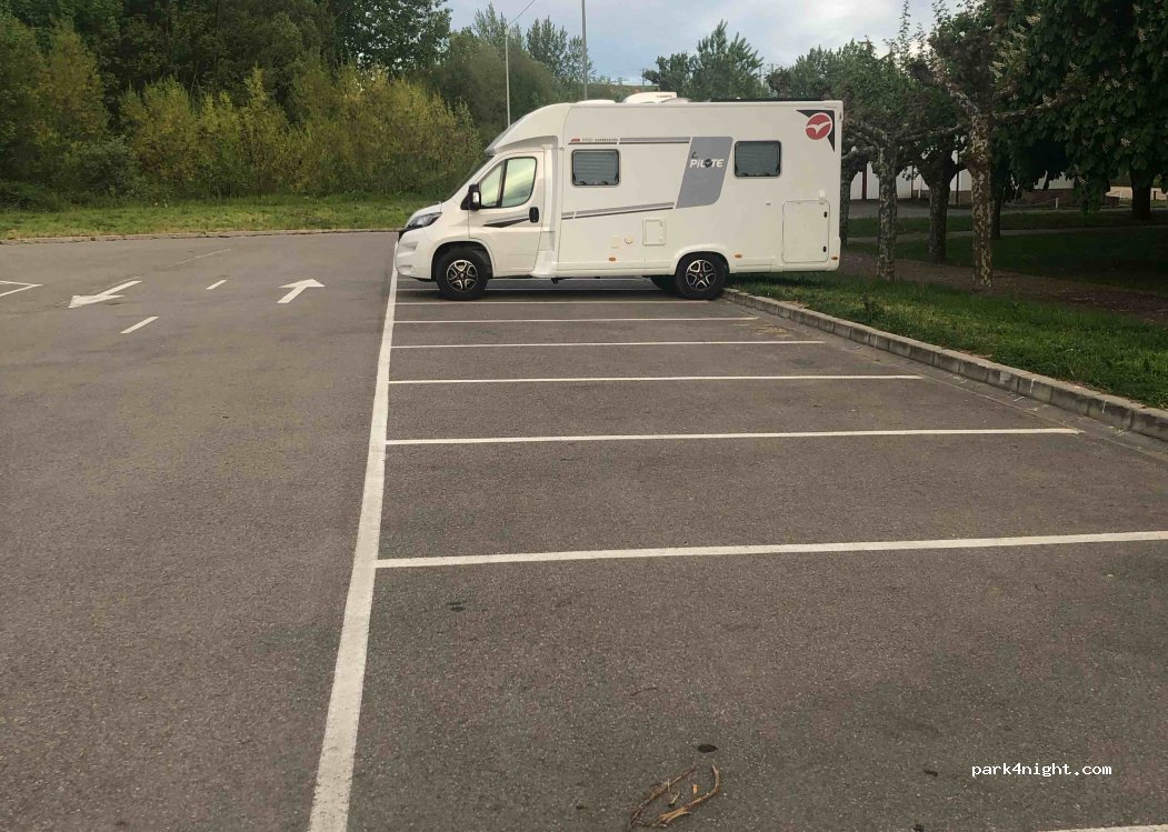 Great free parking area in a large carpark, easy access. Situated between small park and the river. Quiet at night and just pilgrims on the Camino pass during the day. No services except bins. Short easy walk into town. Good for dogs.