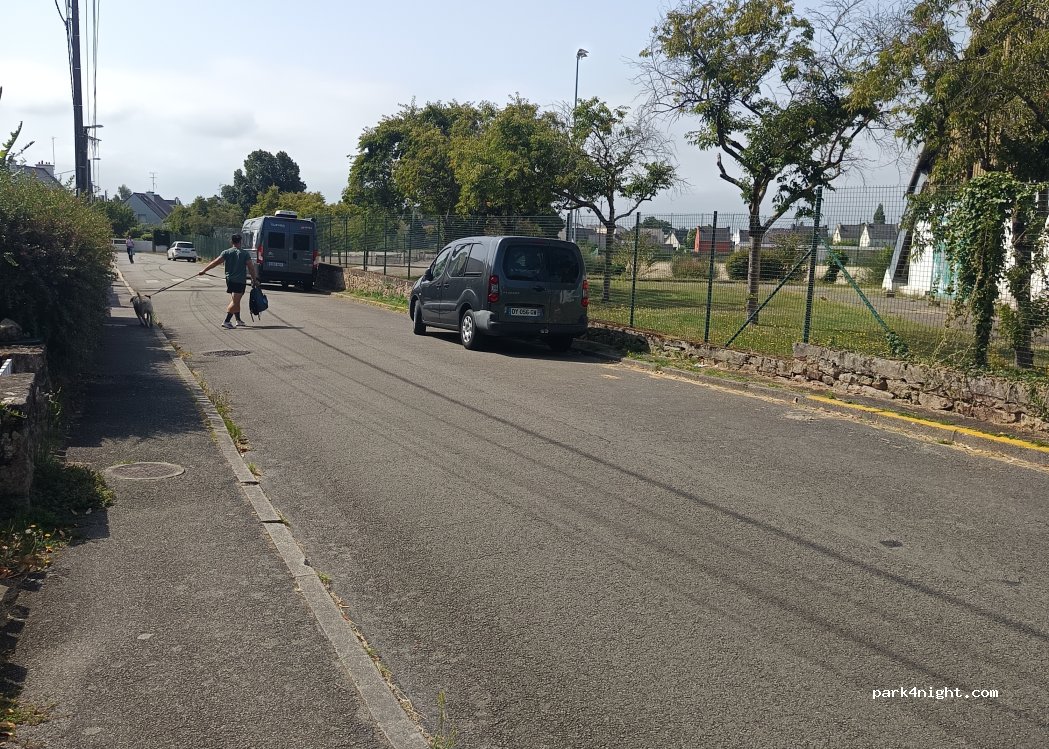 Président René Coty street next to an open-air sports center. Good place To visit the city, it is a 10-minute walk from the town hall square. To visit the city on a Sunday there is no alternative but to find a central parking space, since public transport is very scarce. We spent the night in a very quiet parking lot (in the town of Séné) on the outskirts of the city.