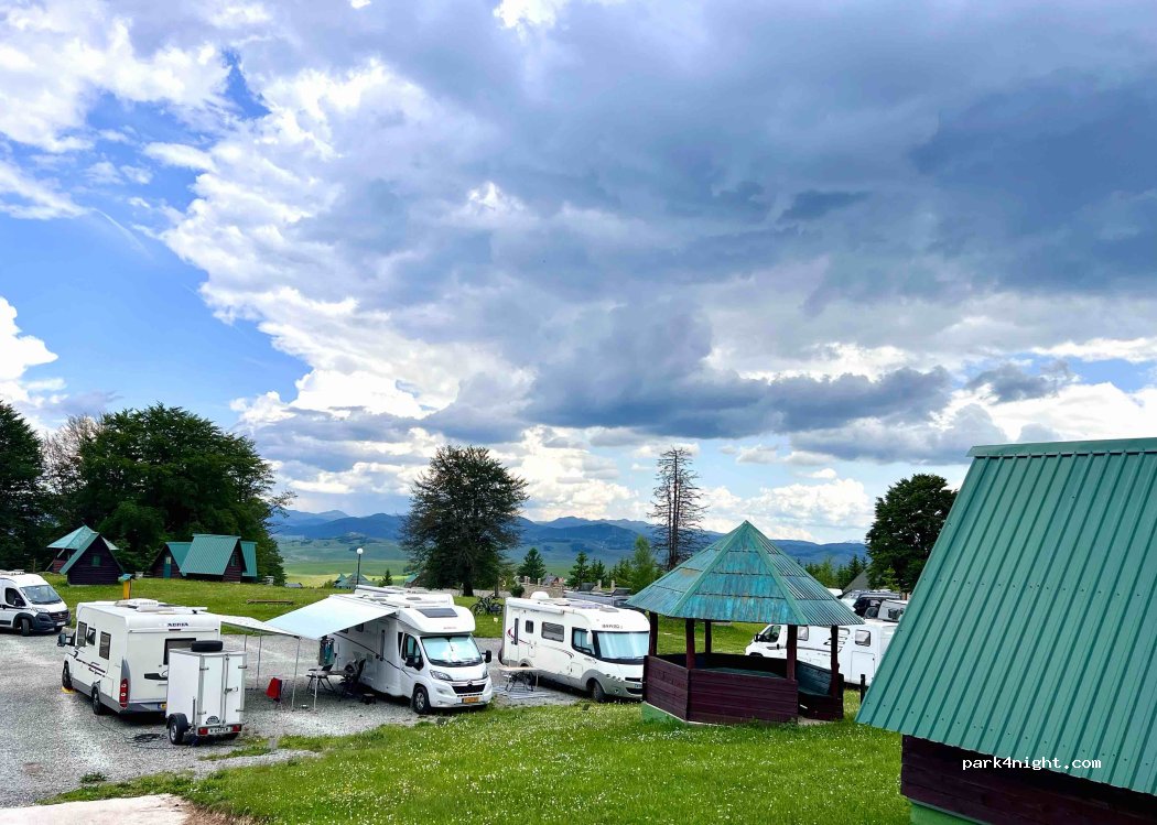 Amplio zona de aparcamiento sin parcelas con excelentes vistas y buenos servicios y cocina. El acceso es fácil si se sigue la carretera hasta este punto 43.147857,19.123446 y se gira para subir por una carretera estrecha pero asfaltada y fácil sobre un km hasta el camping que está a la izquierda.