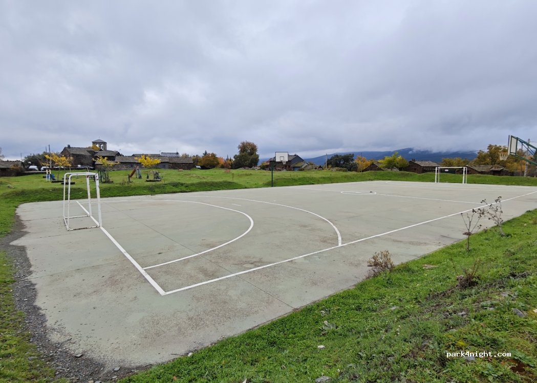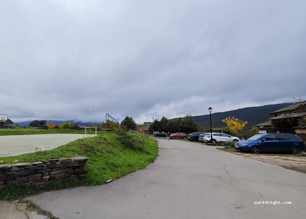 Aparcamientos de asfalto al lado del campo de football, un parque y varias casas rurales. Zona amplia y tranquila.
