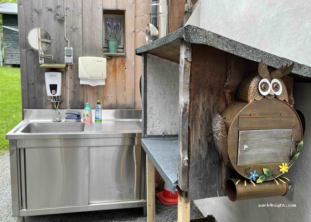 Toilette, ein Aufwaschplatz und eine Dusche sind vorhanden.