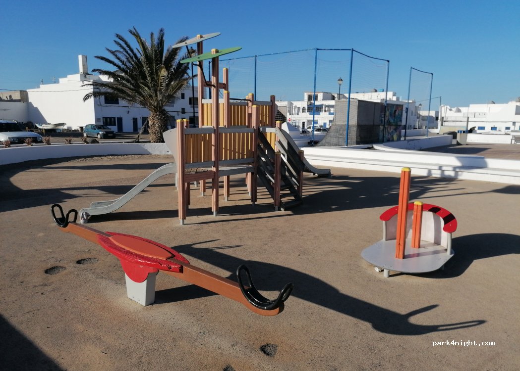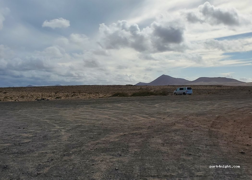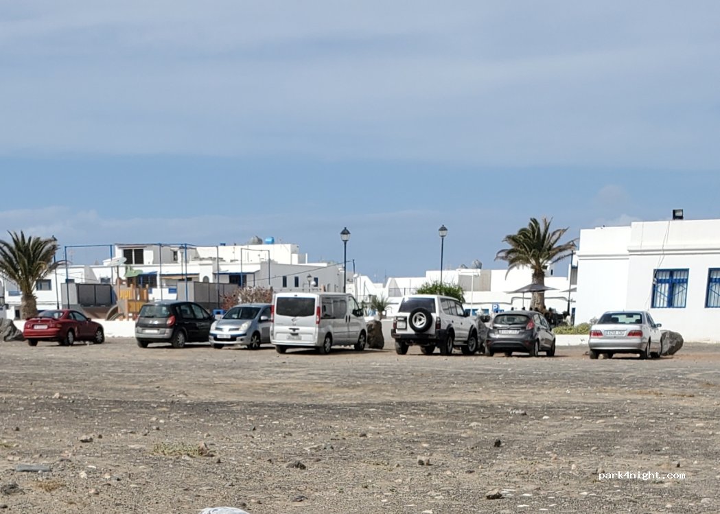 Hicimos noche aquí al no poder llegar a la playa de Famara porque la carretera de acceso está cortada por obras. Está bastante nivelado. Buenas vistas del paisaje, aunque no se ve la playa. Está al lado de la carretera pero no tiene demasiado movimiento. Noche tranquila. Hay contenedores de basura al lado.