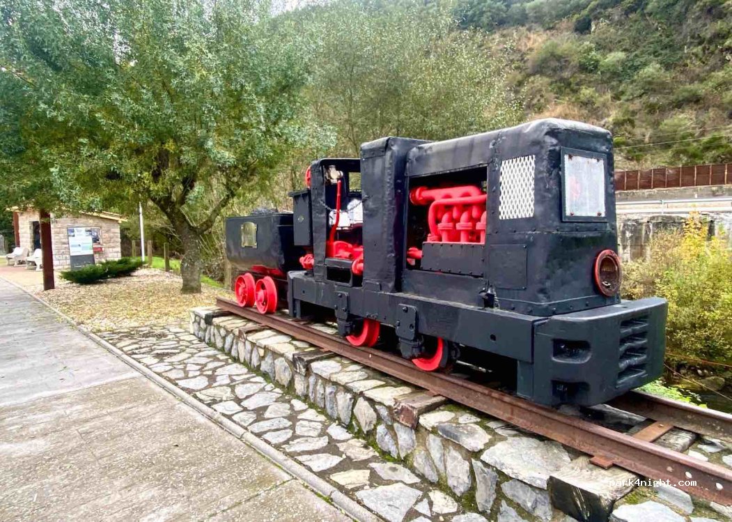 Aparcamiento con buena anchura al lado de la antigua máquina del tren minero, lo adecuado para una parada y visitar el Faedo de Ciñera en cualquier época del año, especialmente en otoño.
