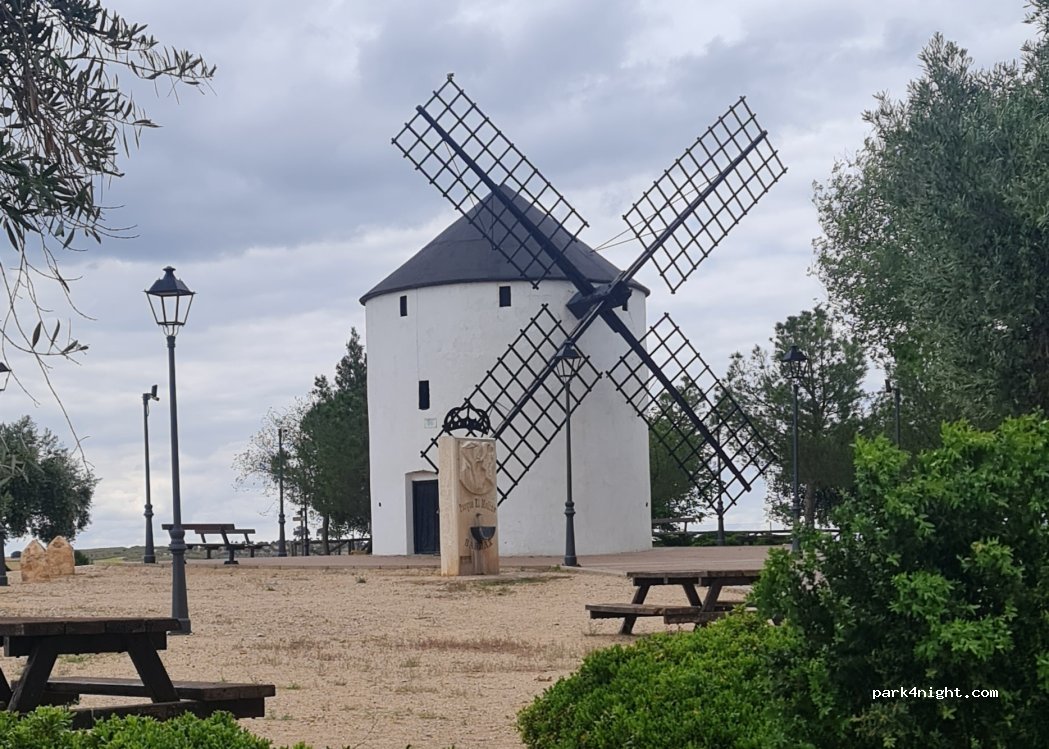Parking au pied d’un moulin de La Mancha. Calme.