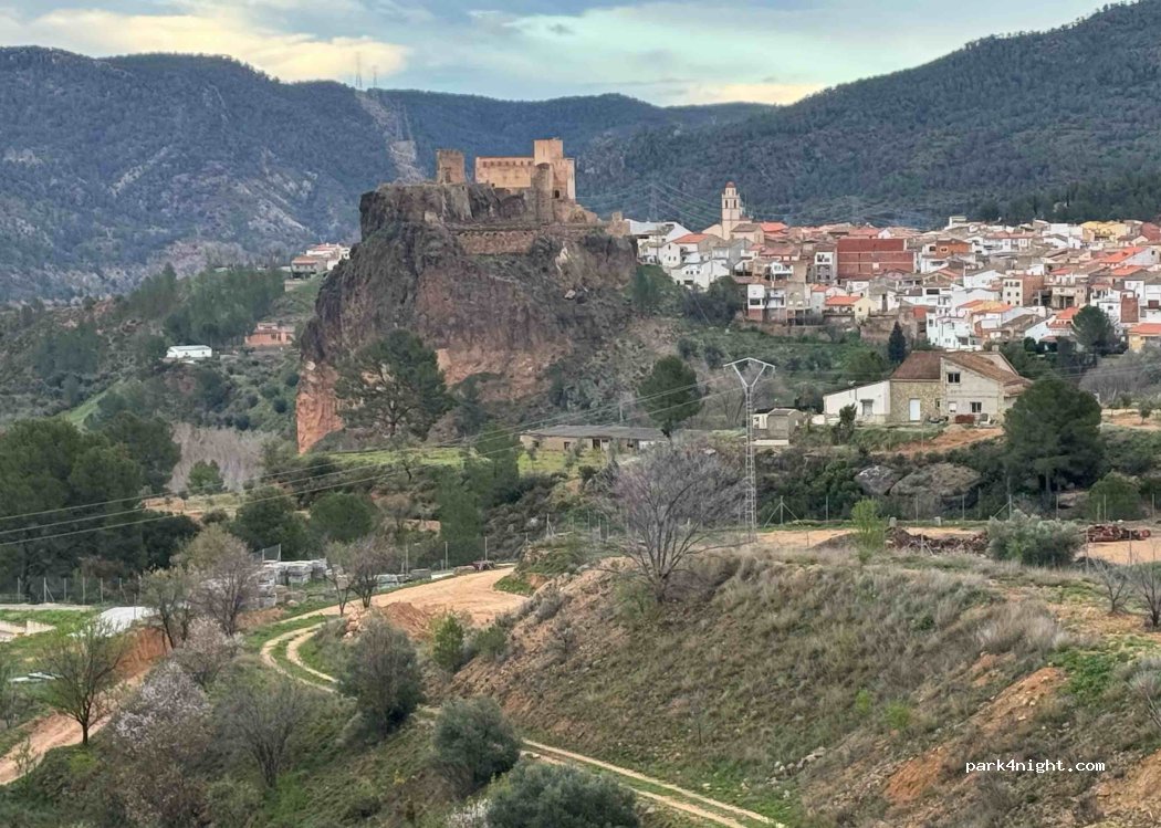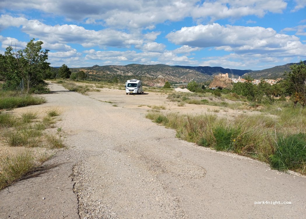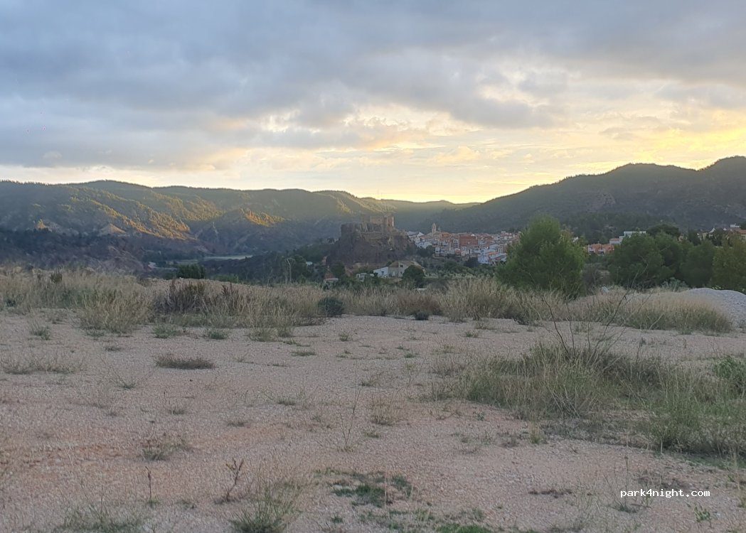 Wide open area not far from quiet road; view of near village of Cofrentes and castle and the cooling towers of nearby nuclear power station. Very quiet. Space for several campers if necessary. Not much shade, so, in summer it can be hot.