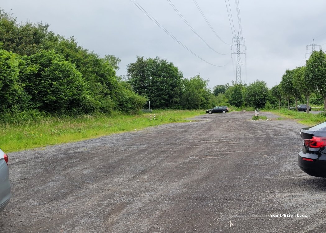 Ein Schotterparkplatz für Fahrzeuge bis max 2m Höhe (Durchfahrtsbschränkung). Keine Beleuchtung, dafür sieht man einen schönen Sternenhimmel. Aber von ruhiger Nacht kann keine Rede sein. Beide Straßen dort sind auch nachts sehr stark befahren. Da kann man genauso gut neben der Autobahn stehen. Mit Ohrstöpseln aber machbar.