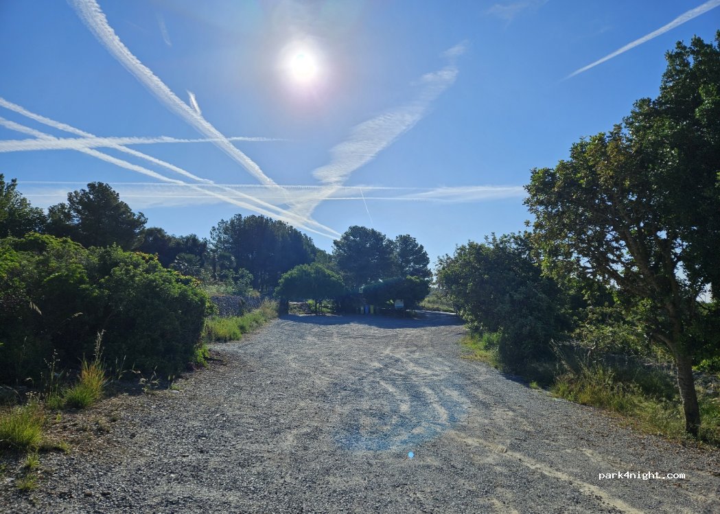 Parqueadero pequeño de grava 5 AC aproximadamente, en un clima muy agradable cerca a Barcelona, pase 2 noches aqui y estuvieron bastante bien, una de las noches hubieron muchos coches en la subida haciendo ruido, a veces se escuchan los aviones, y puede llegar a hacer mucho viento, pero es un spot agradable en general, solo tiene cubos de basura, hay duchas en la playa más cercana