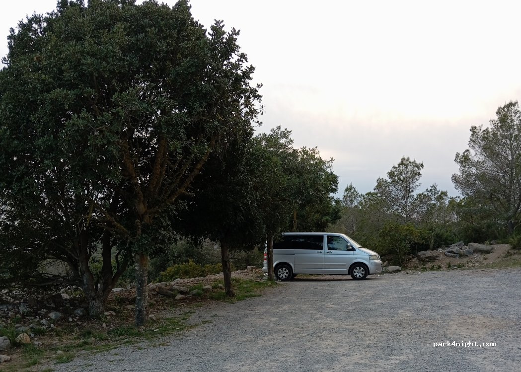 Wir landeten hier nach einer steilen, beängstigenden Fahrt die Bergstraße hinauf. ein schöner flacher Parkplatz mit nur 2 Autos dort als wir ankamen und einen Blick auf das Meer. Das Ende des Parkplatzes ist weit genug von der Straße entfernt, um etwas Privatsphäre und Ruhe zu haben, mit Bäumen als Schatten und zum Aufhängen unserer Hängematten. Über Übernachtungen wurde beim Eingang nichts gesagt, scheint ok! Kein/Kaum Netz